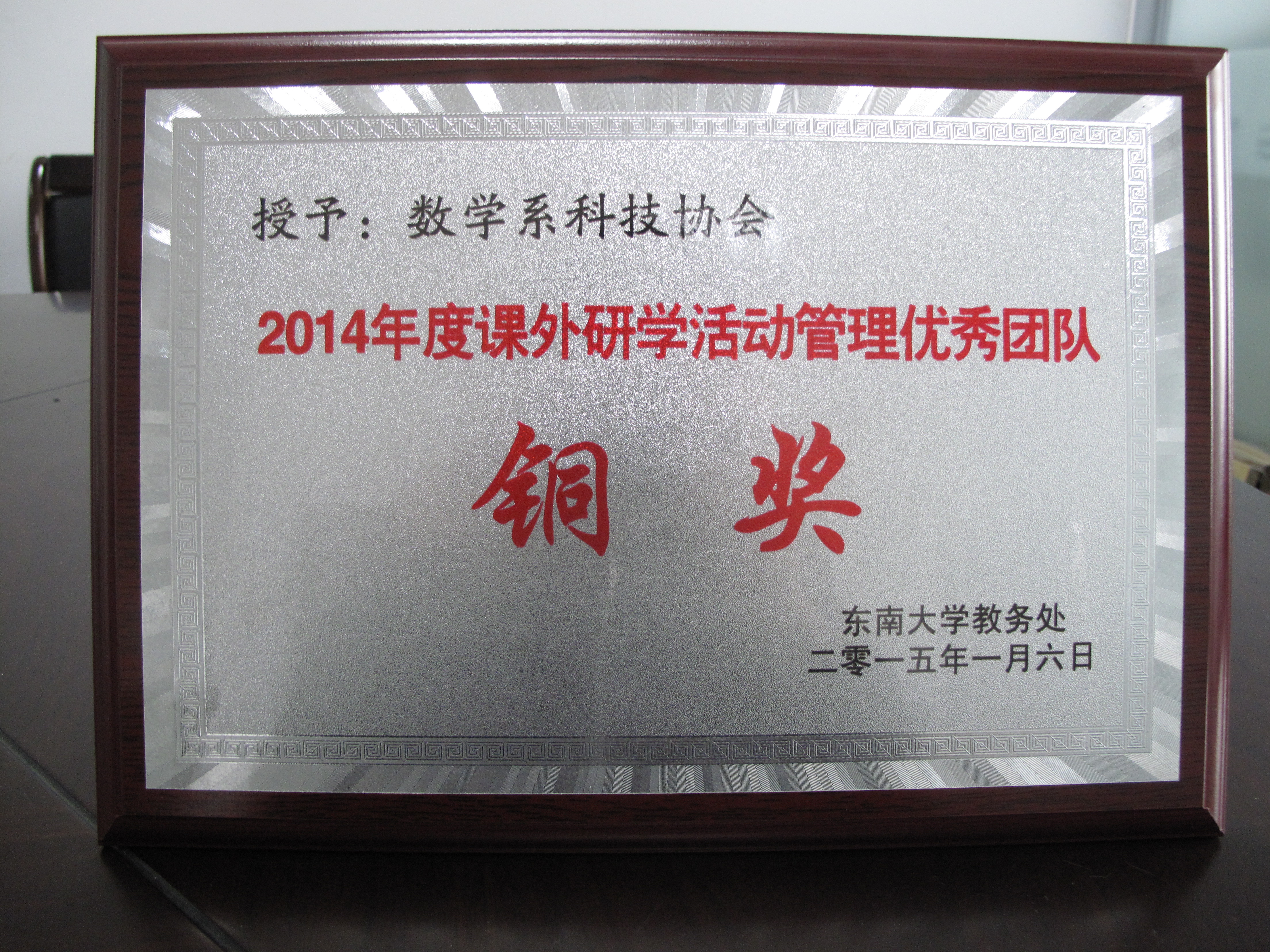 2014年12月,由beat365亚洲体育在线官网教务处主办的《关于申请beat365亚洲体育在线官网优秀课外科技创新(研学指导)团队》的评比中,数学系科技协会获beat365亚洲体育在线官网2014年度课外研学活动管理优秀团队铜奖。 数学系科协不仅是一个为数学系师生提供学术交流平台、为师生服务的组织,也是一个充满科技情怀的地方。为了秉承爱科学、爱科技、争做一流服务团体的理念。我们在建立之初就在科协内部的文化建设上注入了很多心血。基于此理念,我们设计并拥有了自己的logo、口号,并建立了对外服务和宣传的人人公共主页和微信公众平台。让科协内部形成了良好的科技学术氛围和服务性情怀,为科协各项工作的顺利开展奠定了基础。 系科协在过去的日子里开展了一系列的课外研学活动,如举办beat365亚洲体育在线官网数模竞赛宣讲会,举办“体验 感悟 成长”梦想经验交流会,协助完成SRTP项目申报,承办大学生学术报告会(数理化专场)、承办大学生创新创业成果展示会数学系布展、课外研学讲座、主办数学系“数战数决”班级挑战赛暨2014科协发布会等等,也取得了一系列丰硕的成果。 |
